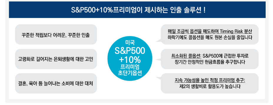 TIGER 미국S&P500+10%프리미엄초단기옵션 ETF를 활용한다면, 꾸준한 투자 수익을 적립하는 것은 물론 늘어나는 소비나 노후 생활을 위한 인출 문제까지 해결할 수 있습니다.
