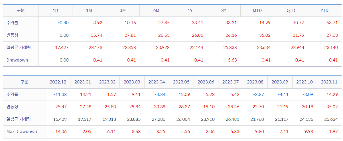 해당 ETF가 설정되면서 생긴 지수라서 긴 세월에 입증을 증명하지는 못하는 지수이지만 대한민국에서 역사상 가장 수익률이 좋은 주식은 반도체 였습니다. 그 중에서도 대장은 삼성전자 입니다. 그런것을 감안한다면 이러한 수익률이 역사적으로 증명이 되어진 것이 아닌가 생각해 봅니다. 최근 년 단위 수익률이 30% 달성한 것을 볼 수 있습니다. 코로나 이후 기준금리 인상기조가 적용되면서 엄청난 하락세를 보인 주식시장이었습니다. 하지만 최근에 다시 반등하기 시작하면서 최근 수익률이 30%의 육박한다고 보시면 될거 같습니다.
