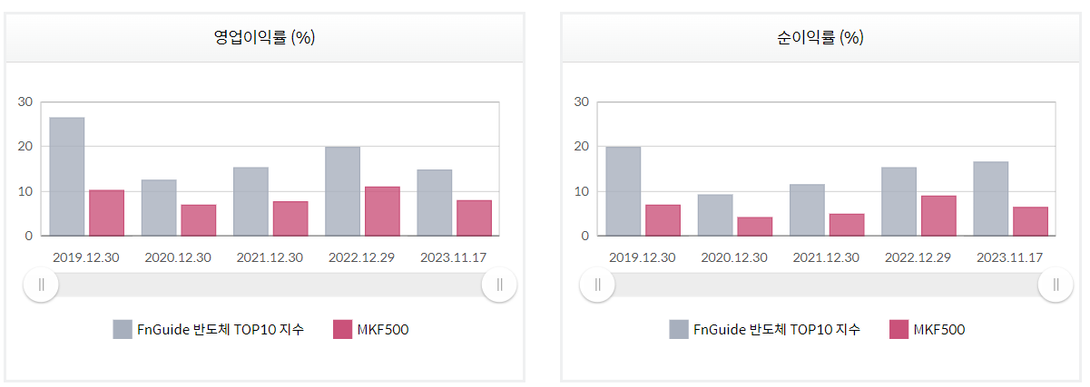 최근 들어 반도체 경기가 좋아지면서 영업이률과 순이익률도 올라오고 있는 추세로 판단이 되어집니다. 한번 더 이야기 하지만 불경기에 사서 호황기에 팔아야 됨을 잊지 마십시오. 그러한 지표들이 위에 영업이이률과 순이익률을 통해서도 판단 할 수 있습니다.