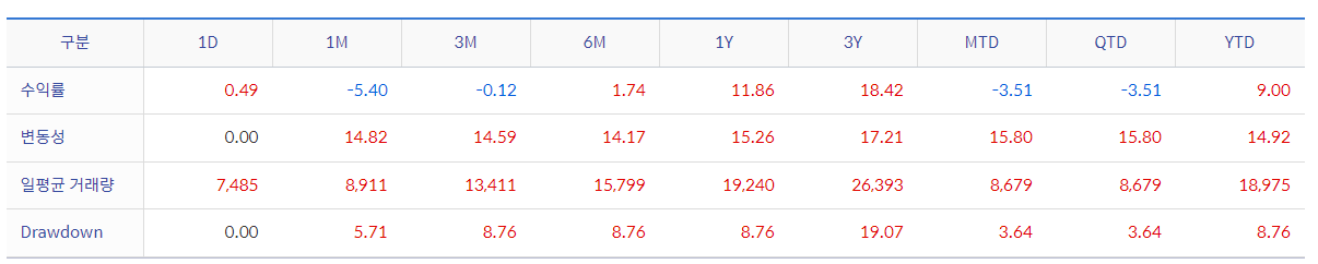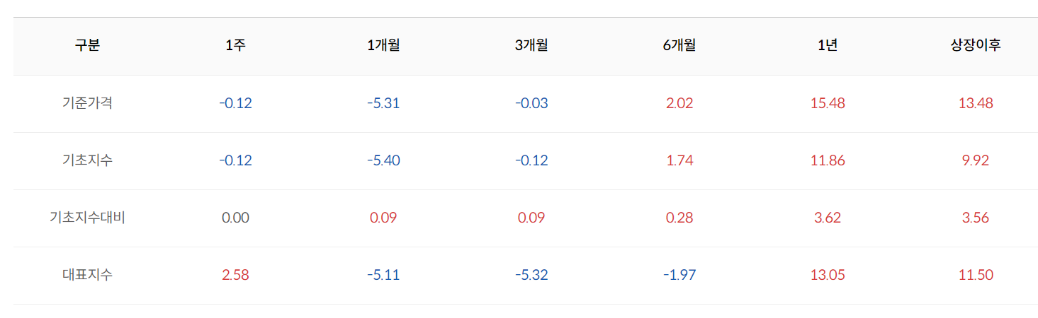 2023년 4월경의 출시된 ETF 라서 상장기간이 잛은 단점이 있습니다. 하지만 상장이후에 좋은 실적이 꾸준히 내고 있는 ETF입니다. 상장이후의 수익률이 준수하고 기초지수의 실적을 보았을 때 방어력이 상당한 포트폴리오라고 생각합니다. 하지만 최근의 주식시장이 강세장이라서 이러한 실적을 가졌다는 점을 감안한다면 시간이 지나 하락의 수익률도 기록할 수 있을거라 판단이 됩니다.