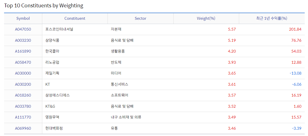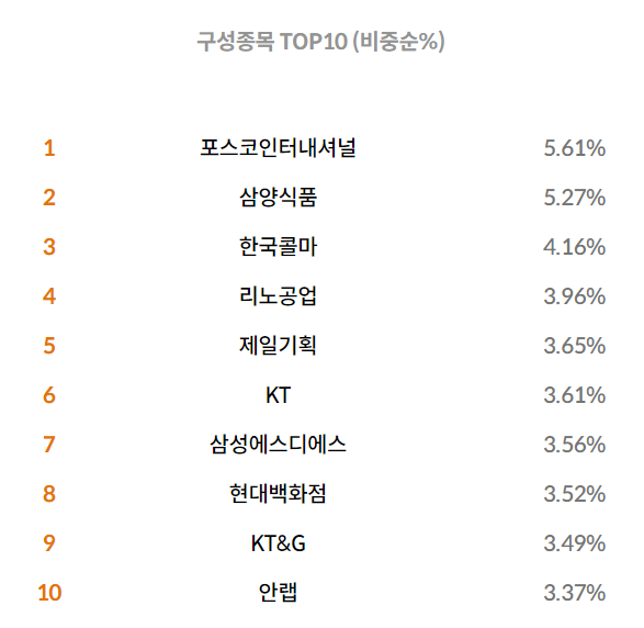 현재 해당 ETF의 상위 비중은 포스코인터내셔널이 차지하고 있습니다. 그 뒤로 삼양식품, 한국콜마, 리노공업, 제일기획, KT, 삼성에스디에스, 현대백화점, KT&G, 안랩 순으로 포트폴리오에서 상위 비중에 올라와 있습니다.