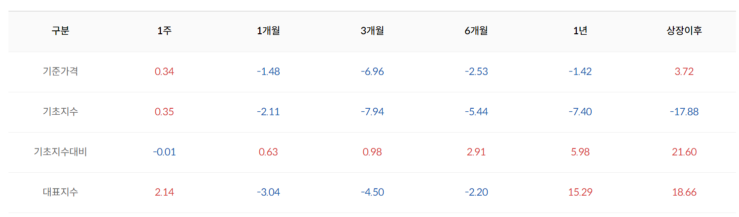 부동산 불패신화라는 한국에서 다소 아쉬운 수익률을 기록하고 있습니다. 2019년도에 최초 상장을 하여 현재까지 거래소 시장에 남아 있는 ETF 입니다. 부동산의 초기 상승이 2015년부터 이어졌기에 그 이전부터 해당 ETF가 거래소에 상장되어 왔다면 더 큰 수익률을 달성할 수 있었을 거라 생각됩니다. 다음 부동산 대세상승기가 금리사이클에 의해서 도달할 것으로 판단이 되어지니, 그러한 사이클에 잘 맞추어서 사이클 투자를 할 수 있는 분이라면 충분한 수익률을 달성할 수 있지 않을까 하는 생각이 듭니다.