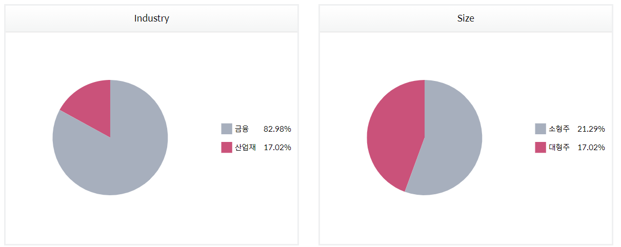 지수의 궁서비는 금융업이 82%이며 나머지 17%는 산업재에 해당이 됩니다. 뒤에서도 언급하겠지만 부동산 섹터에 해당되는 종목들은 주로 금융업에 해당이 되며 맥쿼리인프라의 경우 운송업의 기반을 둔다고 하여 산업재로 분류가 되었습니다.