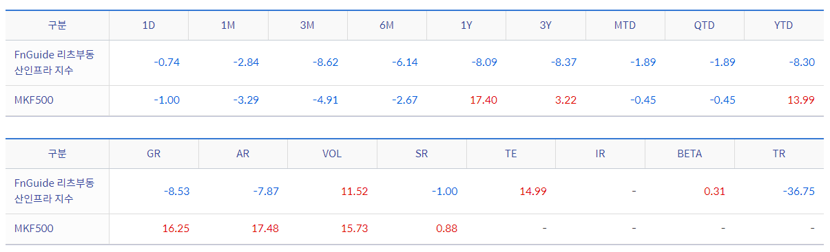 해당 ETF에서는 FnGuide에서 발표하는 리츠부동산 인프라지 지수를 추종합니다. FnGuide 리츠부동산인프라 지수는 유가증권시장 상장 종목 중 기초필터링을 통과한 종목들을 유니버스로 하고, 리츠 및 고배당 종목을 선정하여 구성한 지수입니다. 이러한 지수의 추종 수익률은 다음과 같이 표시 되어지고 있습니다.