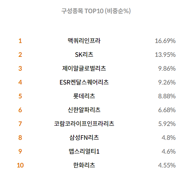 주요 비중은 맥쿼리인프라가 가장 큰 비중을 차지 합니다. 그 뒤를 이어 SK리츠, 제이알글로벌리츠, ESR켄달스퀘어리츠, 롯데리츠, 신한알파리츠, 코람코라이프인프라리츠, 삼성FN리츠, 맵스리얼티, 한화리츠가 상위 종목을 구성하고 있습니다.