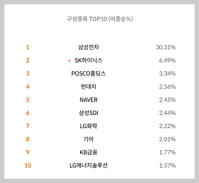 투자 비중이 제일 높은 종목은 삼성전자이며 그 뒤로 SK하이닉스, POSCO홀딩스, 현대차, NAVER, 삼성SDI, LG화학, 기아, KB금융, LG에너지 솔루션으로 구성되어진 포트폴리오 입니다.